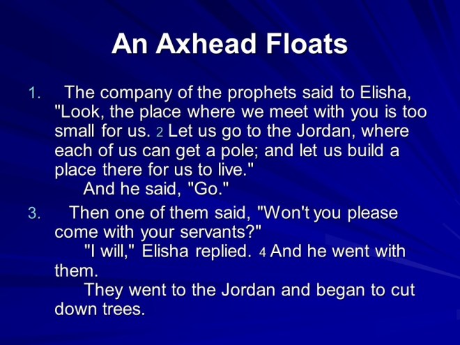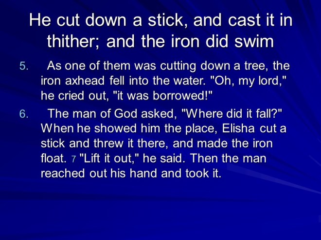2 Kings 6. Elisha made an ax head float, “The Floating Ax Head”, the Syrians tried to capture Elisha from which we get the quote”Fear not: for they that be with us are more than they that be with them.” But later Syria besieged Samaria, and the famine was great.