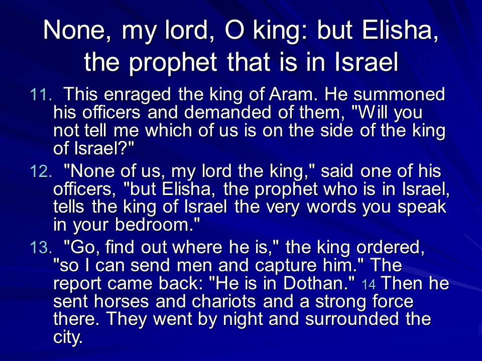 2 Kings 6. Elisha made an ax head float, “The Floating Ax Head”, the Syrians tried to capture Elisha from which we get the quote”Fear not: for they that be with us are more than they that be with them.” But later Syria besieged Samaria with famine.