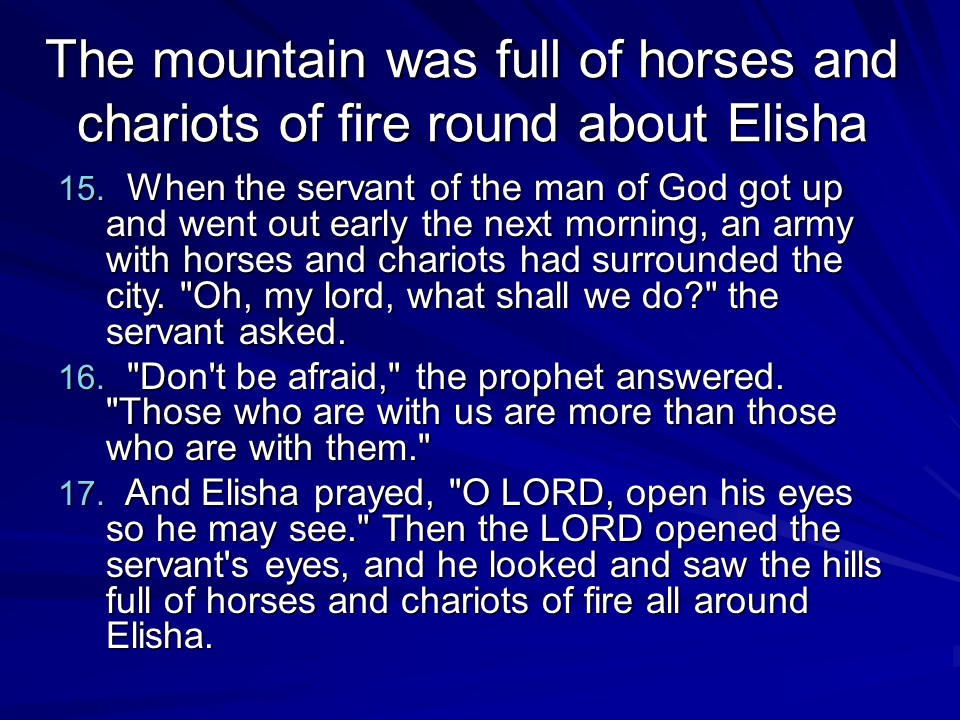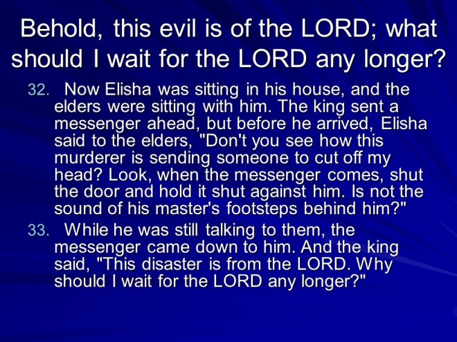 2 Kings 6. Elisha makes an ax head float, The Floating Ax Head, the Syrians ary to capture Elisha from which we ger the quote”Fear not: for they that be with us are more than they that be with them.” But then Syria Besieged Samaria with famine.