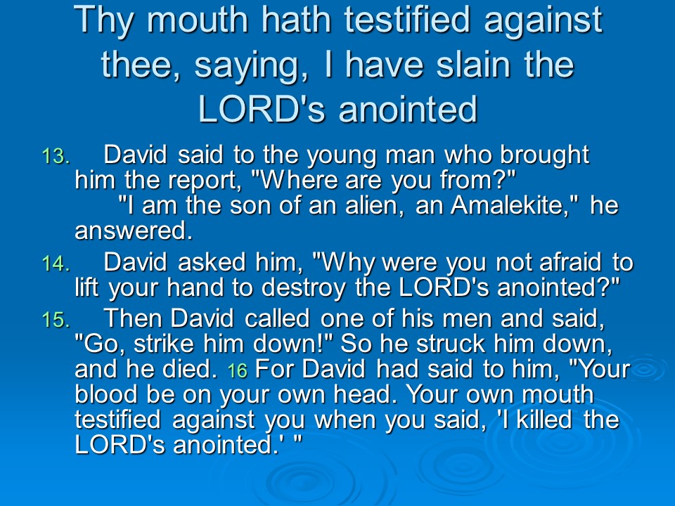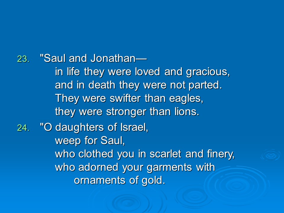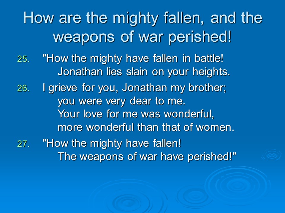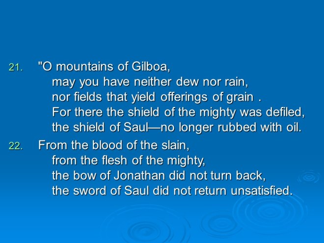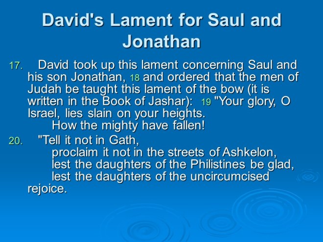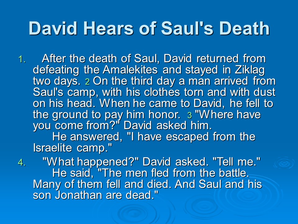 2 Samuel 1. After David got the report of Saul’s death he lamented of the death of Saul and his son, known as the Song of the Bow.