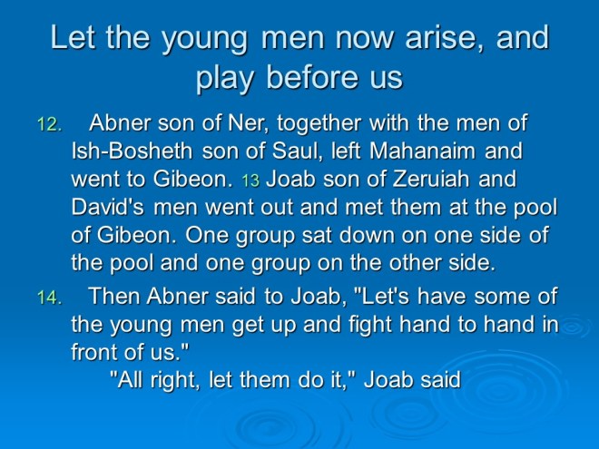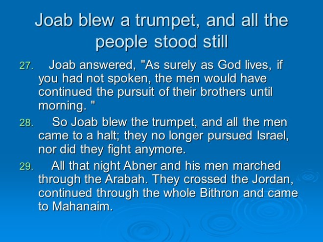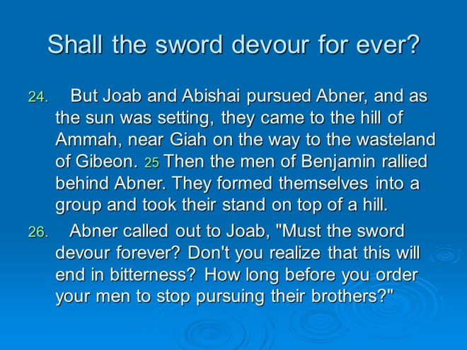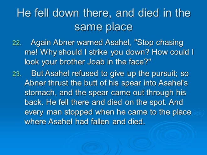2 Samuel 3 starts out with a genealogy of David’s sons. Abner joined forces with David, Joab murdered Abner, and finally is recorded how David mourned Abner.