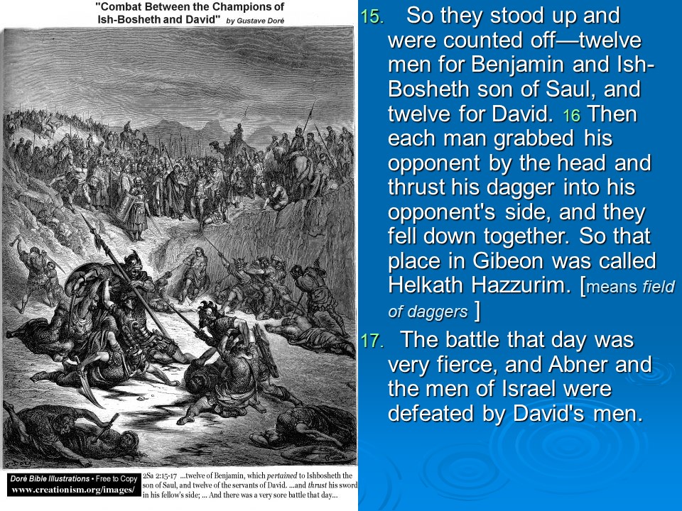 2 Samuel 3 starts out with a genealogy of David’s sons. Abner joined forces with David, Joab murdered Abner, and finally is recorded how David mourned Abner.