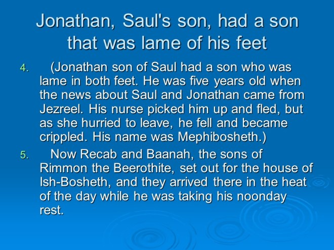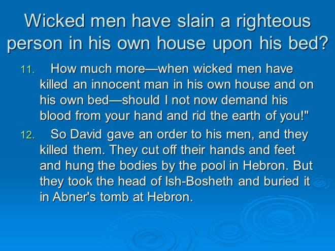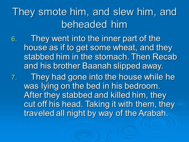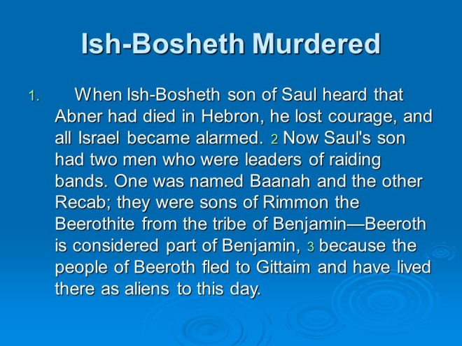 2 Samuel 4 records how Saul’s son Ish-Bosheth was murdered.