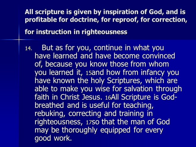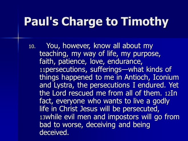 2 Timothy 3. The apostle Paul spoke of perilous times and perilous men, but as for Timothy, he was to be the man of God, and keep in mind“All scripture is given by inspiration of God, and is profitable for doctrine, for reproof, for correction, for instruction in righteousness: That the man of God may be perfect, thoroughly furnished unto all good works.”