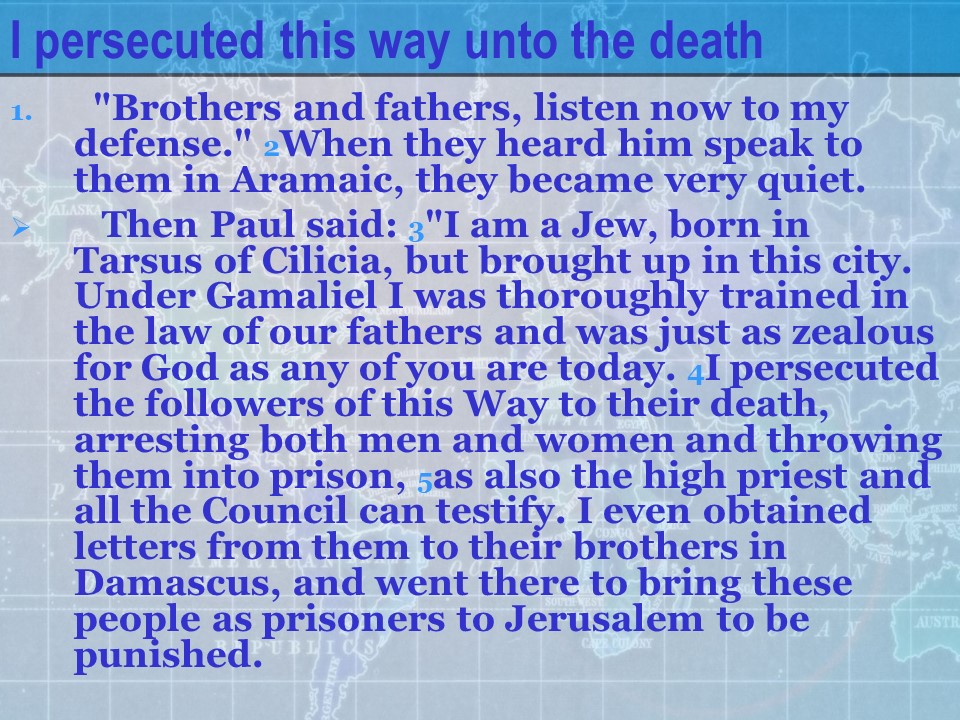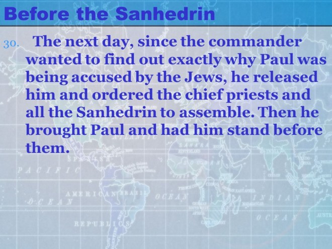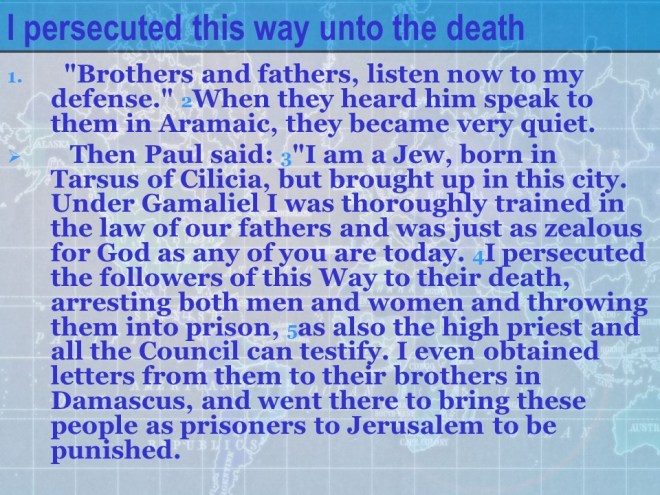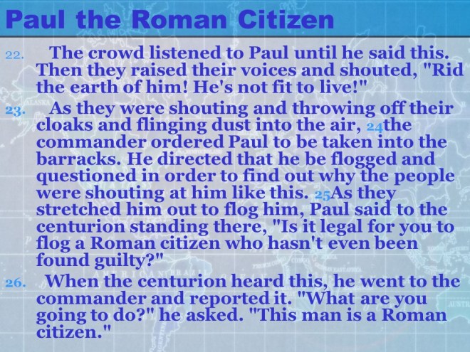 Acts 22. The Apostle Paul gave his salvation testimony to the Jerusalem crowd in the Aramaic language. When Paul mentioned the stoning of Stephen and that he preached to the Gentiles as well, the crowd wanted him killed right away. Paul claimed Roman citizenship, so the next day he was ordered to stand before the Sanhedrin.