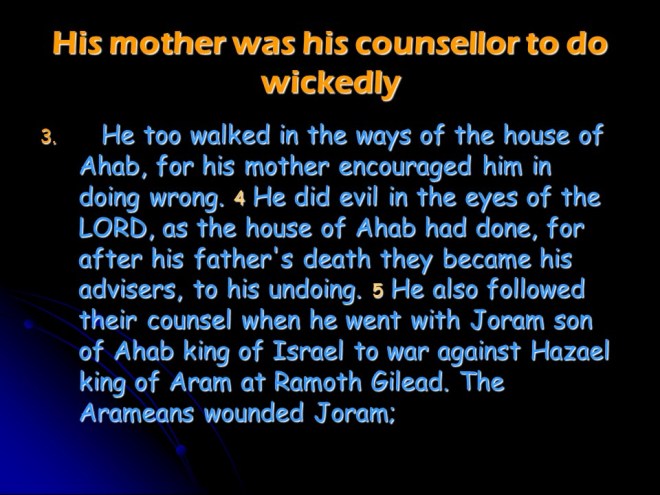 2 Kings 9. Jehu, a man of action was anointed king of Israel, Joram of Israel was killed, Ahaziah of Judah likewise, and finally Jezebel suffered the most humiliating and violent death possible, thrown out from a window, trampled to death by horses and was then eaten by dogs.