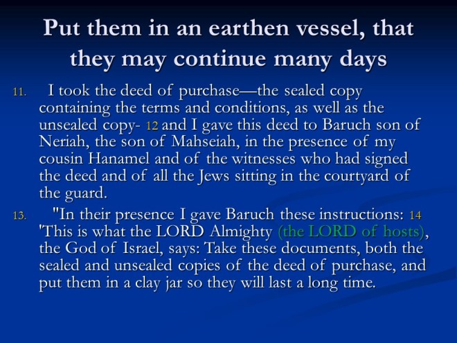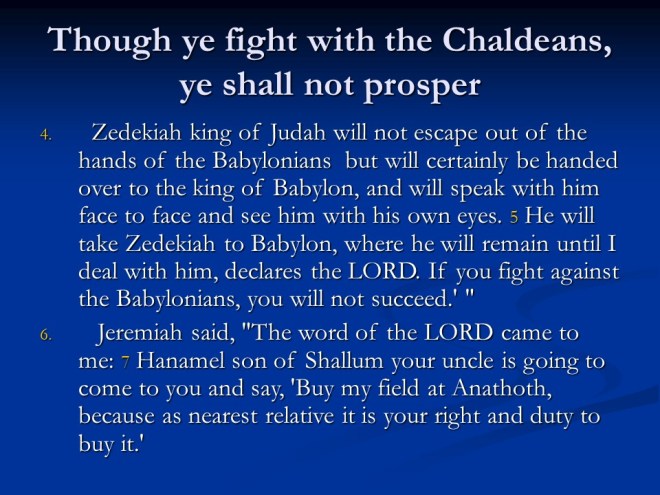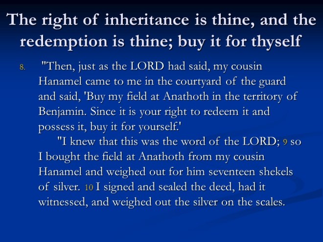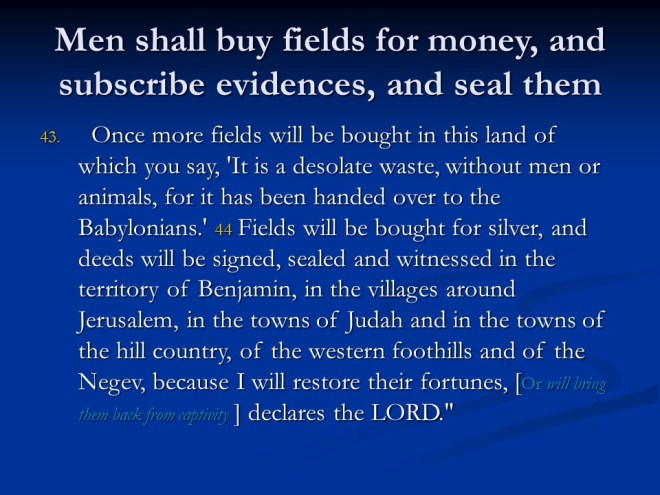 Jeremiah 32. With everything else going on, Jeremiah bought a field, the field of Anathoth, and then he prayed for understanding. God reassured Jeremiah that the people would return.