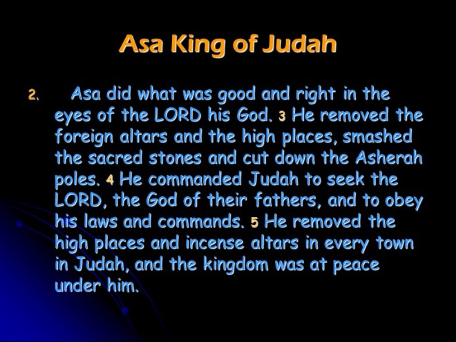 2 Chronicles 15. Asa threw out the idols and repaired the altar before the Temple. People from Israel joined, and thanks to following the LORD Judah had peace until the 35th year of Asa’s reign.