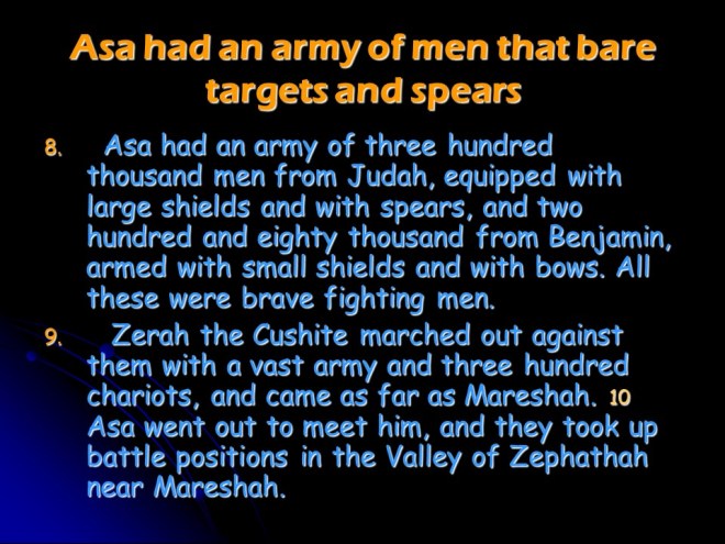 2 Chronicles 14 tells of Asa’s reign in Judah.