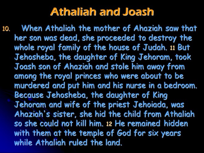 2 Kings 11, Athaliah Reigns in Judah, Joash Crowned King of Judah, Death of Athaliah. 2 Kings 11, Athaliah Reigns in Judah, Joash Crowned King of Judah, Death of Athaliah.