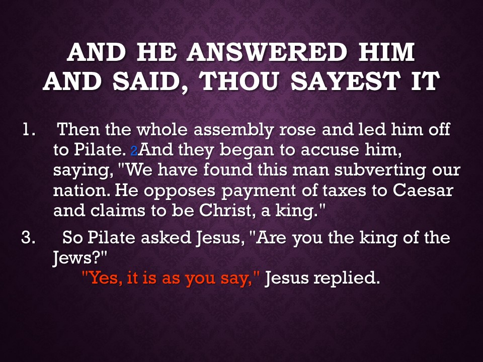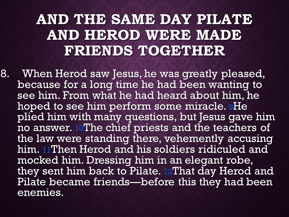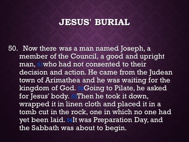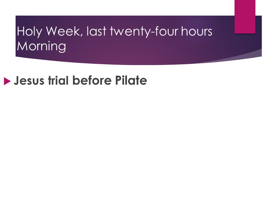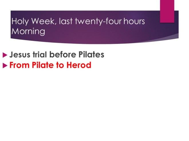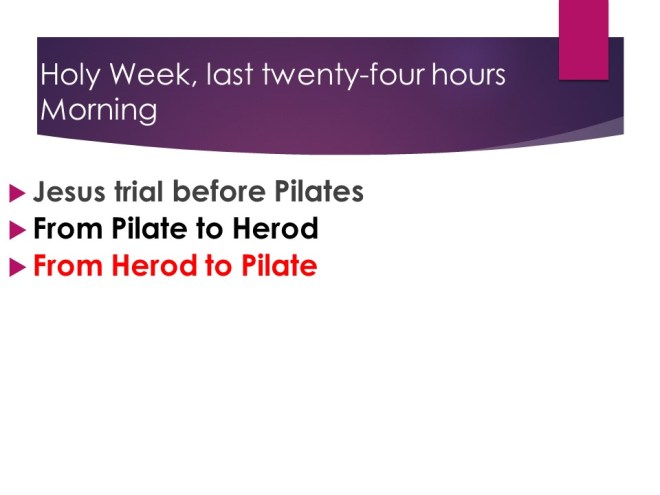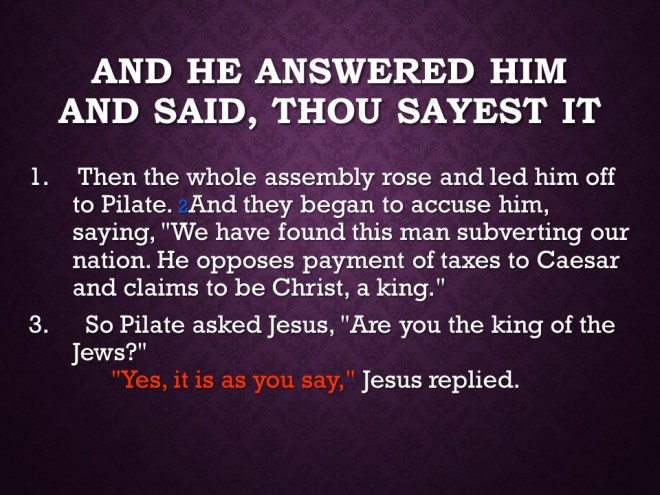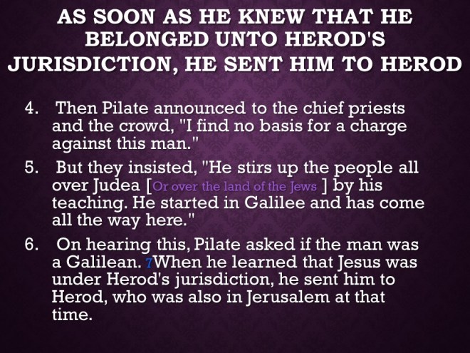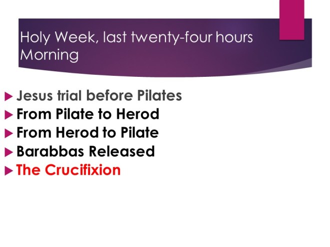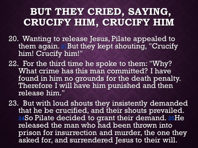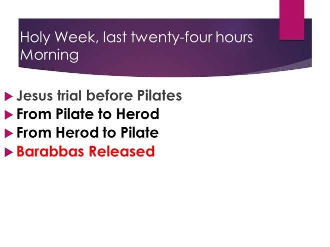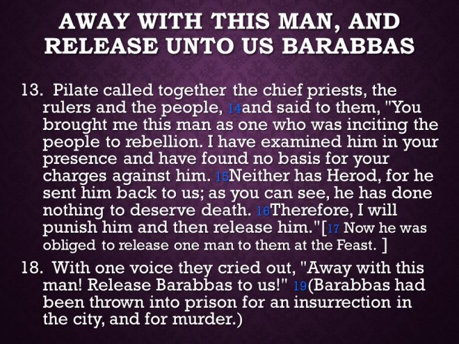 Mark 15:1-20, Early in the morning Jesus was brought before Pilate since only the Romans could execute capital punishment. Pilate, trying to get out of the situation offered to release Barabbas, a known murderer and insurrectionist, or Jesus, and the crowd chose Barabbas. Pilate gave in to the crowd, the Soldiers mocked Jesus, and the verdict was that Jesus the King was to be Crucified.