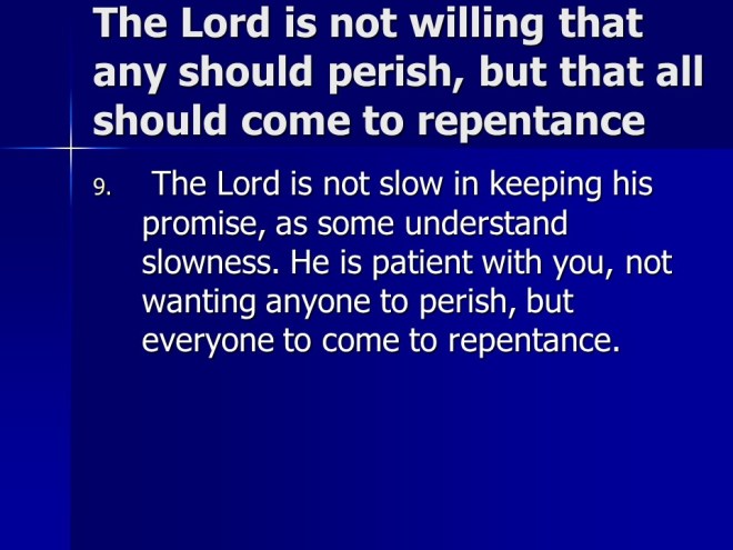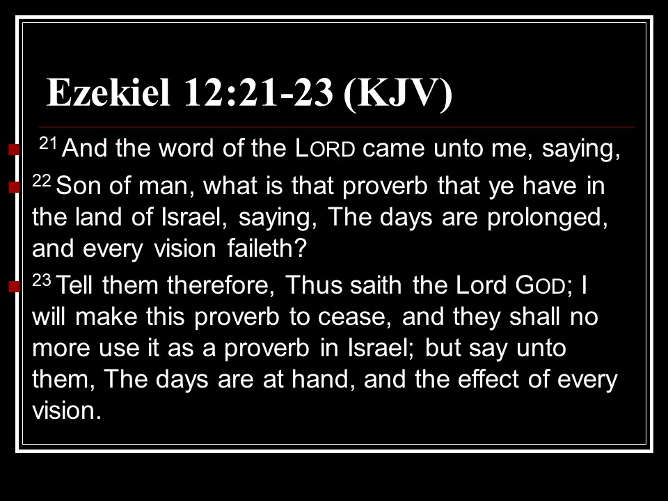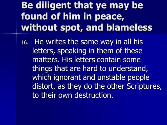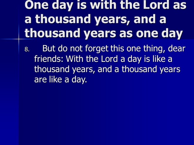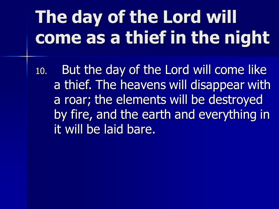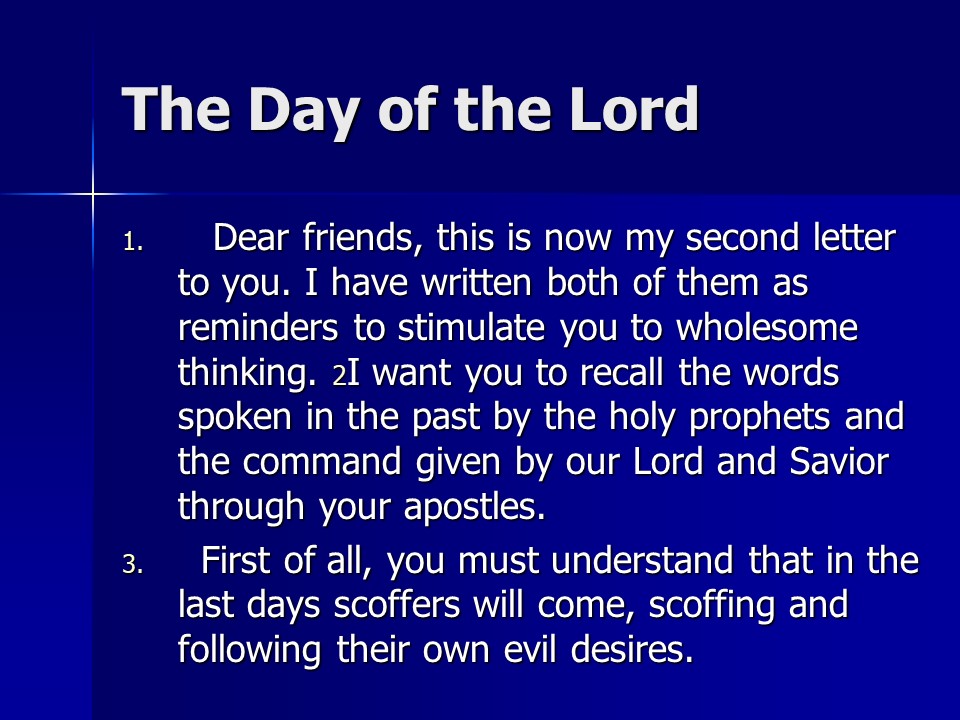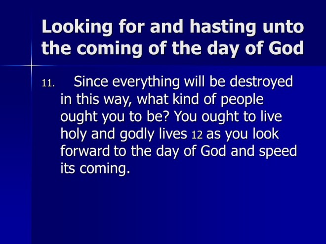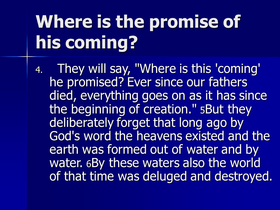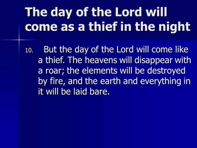2 Peter 3. We live in the last days. God’s promise is not slack. There is coming a Day of the Lord, so be steadfast.