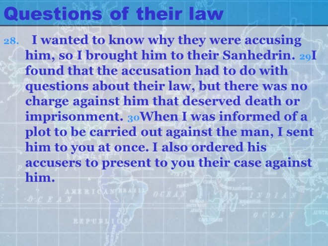 Acts 23. The Apostle Paul gave his message in Jerusalem before the Sanhedrin, which led to the plot to kill Paul. Paul was then sent to Felix under heavy guard.