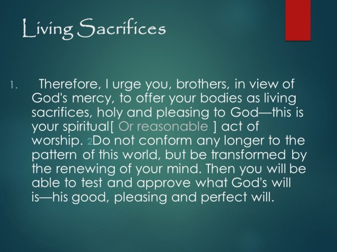 Romans 12:9-21. The Apostle Paul reminds us to behave like Christians (little Christs), act in love, bless those who persecute you and overcome Evil with Good.