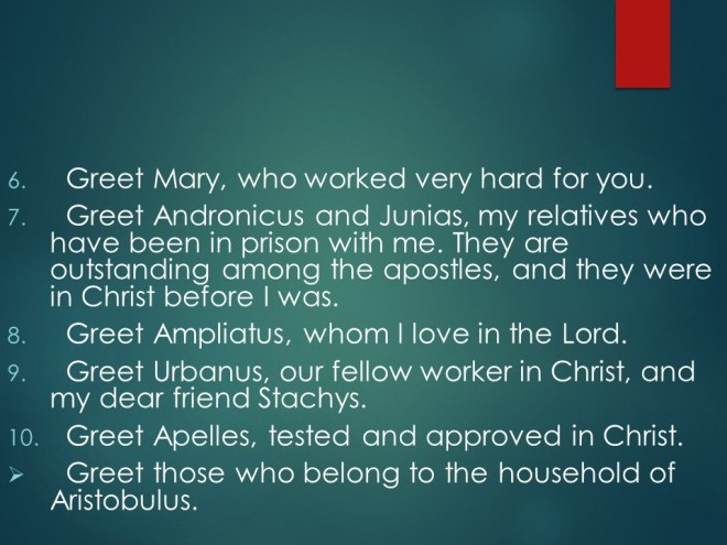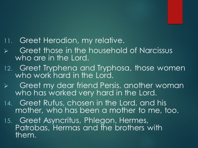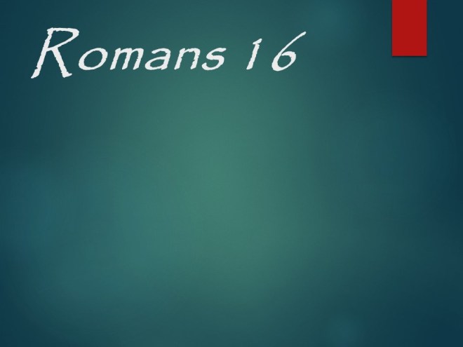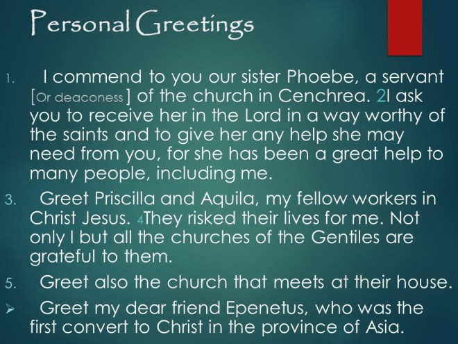 Romans 16, Sister Phoebe Commended, Greeting Roman Saints, Avoid Divisive Persons, Greetings from Paul’s Friends, Benediction.