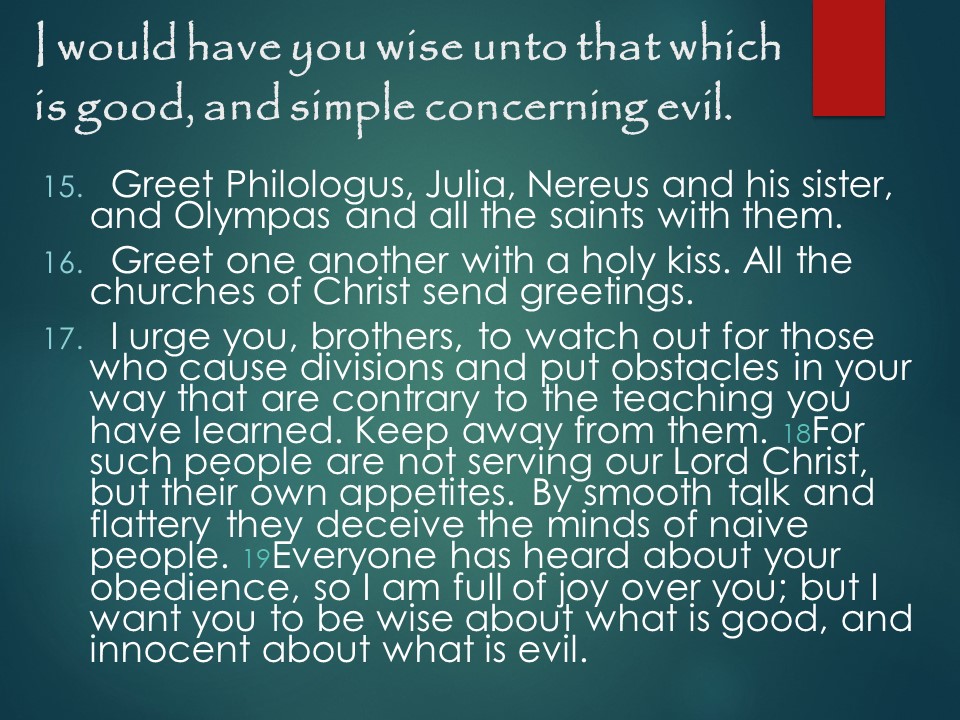 Romans 16, Sister Phoebe Commended, Greeting Roman Saints, Avoid Divisive Persons, Greetings from Paul’s Friends, Benediction.