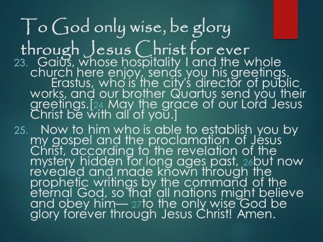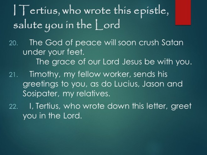 Romans 16. Sister Phoebe is commended, the Apostle Paul gave thanks, especially to Priscilla and Aquila, followed by a long list of greetings by name. Paul then warned the Romans to avoid divisive persons, followed by greetings from Paul’s friends, even Tertius the scribe wrote a note. The letter ends with a benediction.