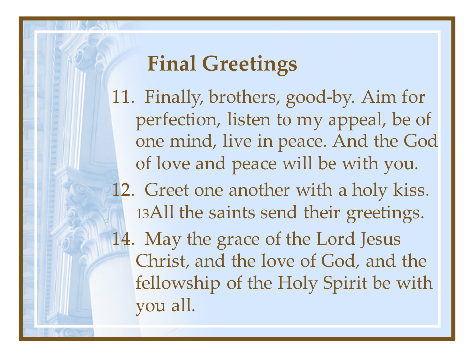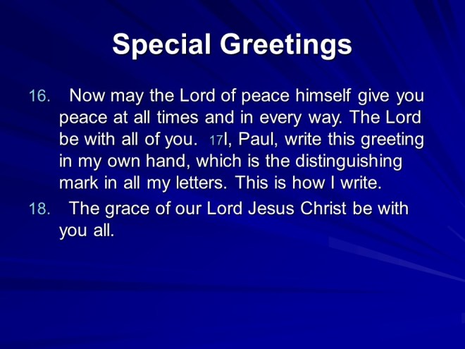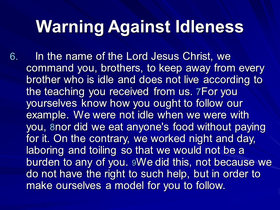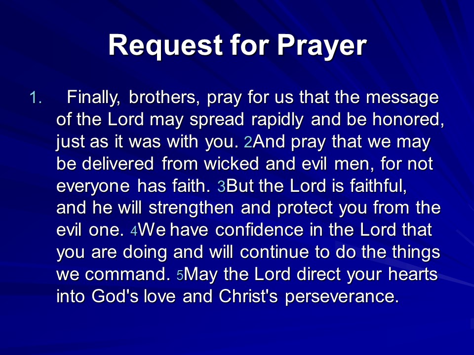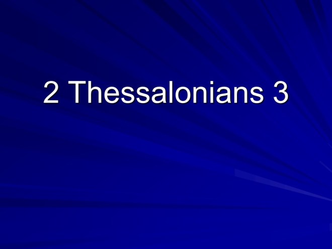 2 Thessalonians 3. The Apostle Paul requested prayer, then he warned against idleness. Finally the letter ends with a benediction.