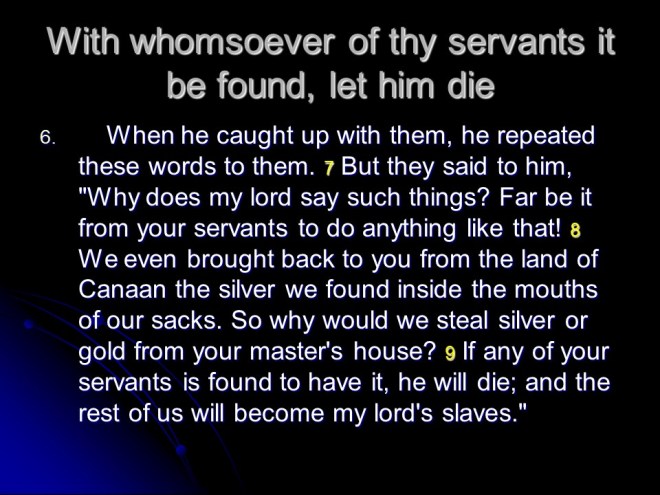 In Genesis 42 there was famine in Canaan, as happened quite regularly, so Joseph’s brothers went down to Egypt to buy food. They met Joseph, now governor of Egypt, and he demanded to see Benjamin, who was left behind with Jacob. They agreed to do so and left one of the brothers behind as collateral. Joseph was very distraught at the proposition, since Joseph and Benjamin were his favorite children.