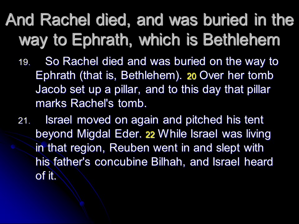Genesis 35. Jacob returned to Bethel, got rid of all the idols and built an altar. Moving on from Bethel, Rachel gave birth to Benjamin, a birth so hard Rachel died in childbirth. The chapter ends with the death of Isaac.