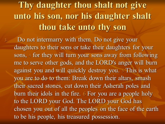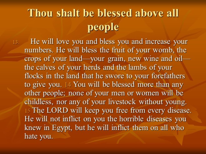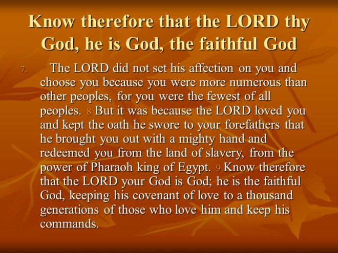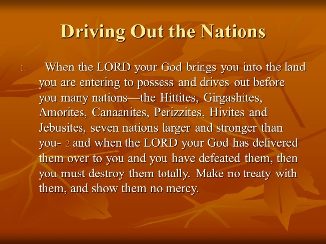 Deuteronomy 7 promised that the Israelites would always be a Chosen People. God will drive out the people before them. When entering the land they must completely destroy all idols and false gods.