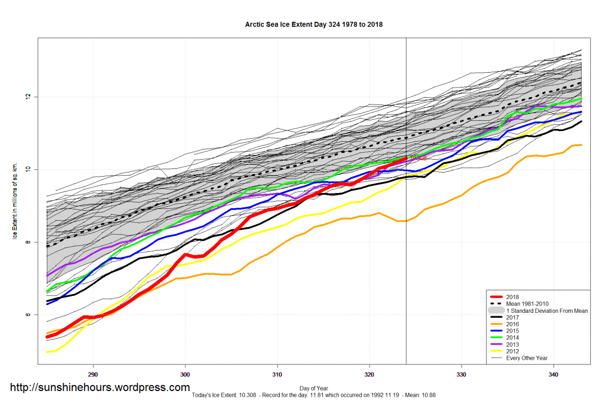 From sunshinehours.net comes this chart, showing the Arctic ice cover has grown from being the lowest on record in October to the highest in the last seven years for Nov 21.