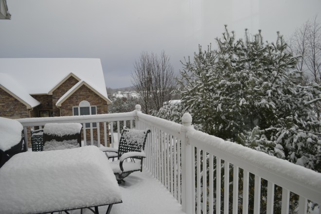 This picture was taken Nov 15 from our porch in Boalsburg, PA. It was a very early snowfall.