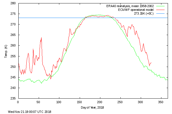 From Rutgers University climate lab comes this chart of fall snow cover in the Northern Hemisphere. This year’s snow cover is about 5% larger than last year at the same day, so we can clearly see that the increasing trend is not broken; if anything, it is accelerating.