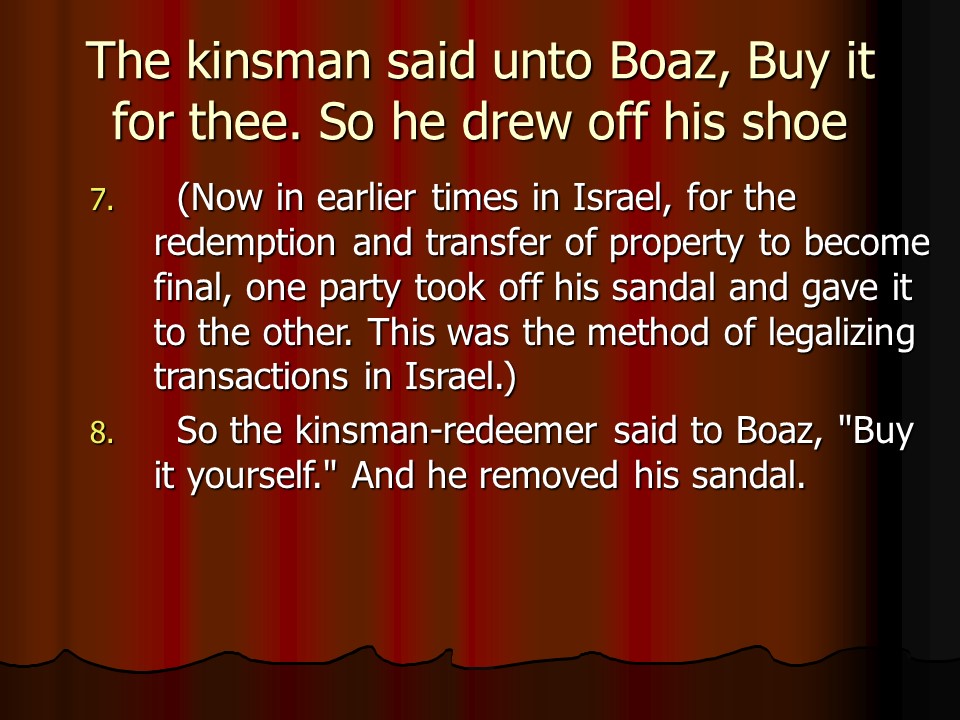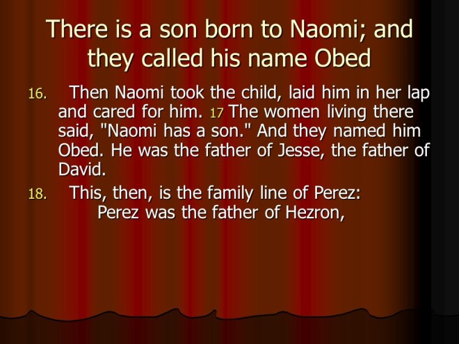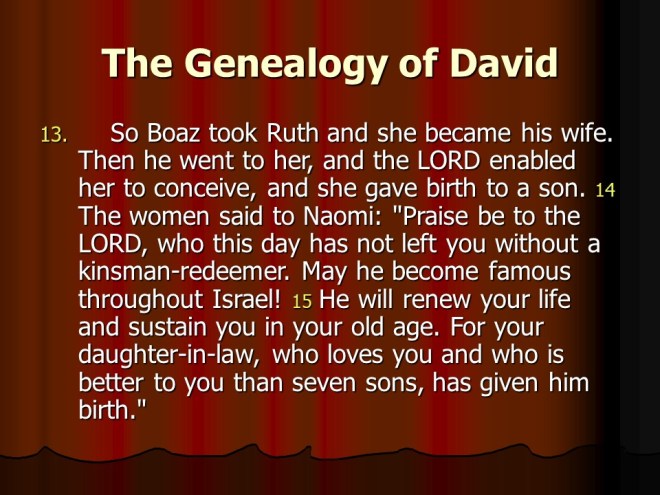 Ruth 4. Boaz redeemed Ruth, and that’s how Ruth came to be in the genealogy of David and Jesus.