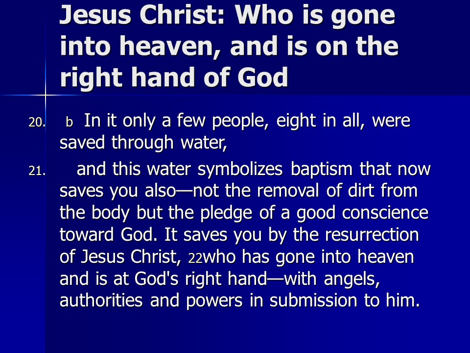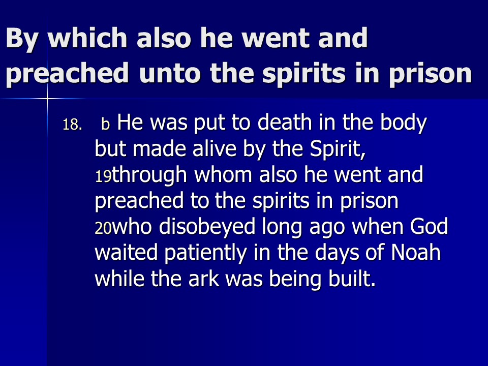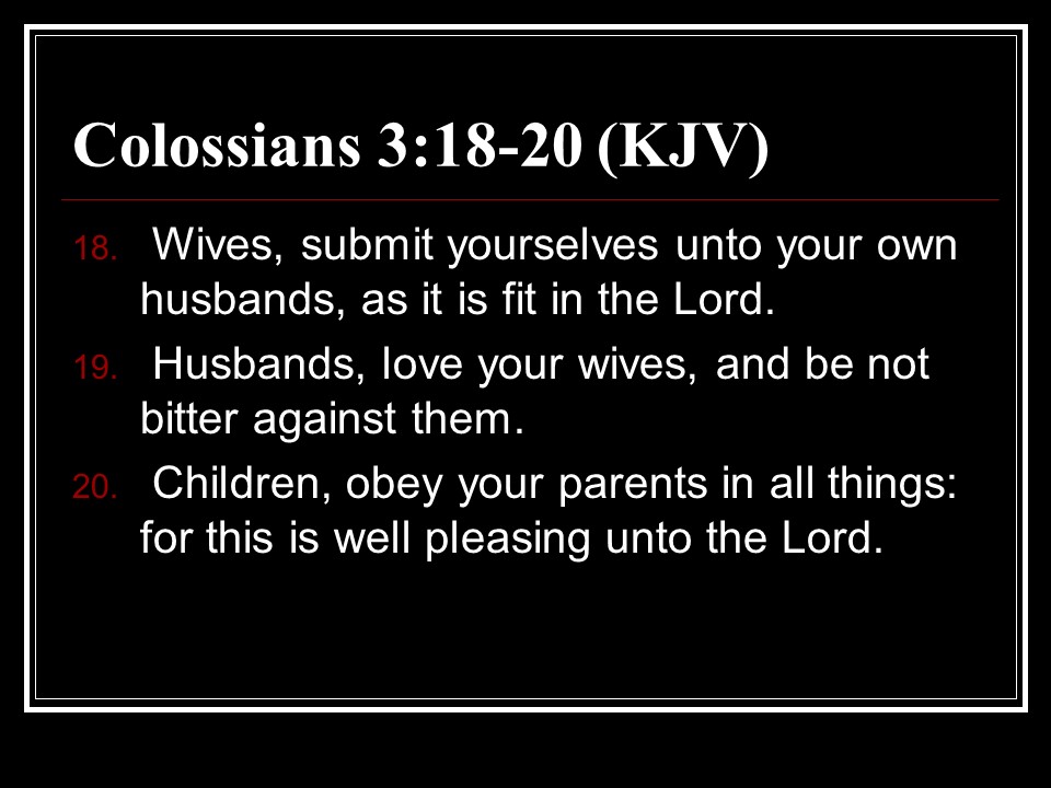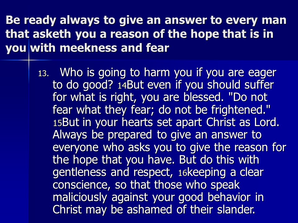 1 Peter 3. The apostle speaks of submission, and it is mutual, both for husbands and wives, joint heirs with Christ. We are called to be a blessing, even during suffering for doing right, “be ready always to give an answer to every man that asketh you a reason of the hope that is in you with meekness and fear.” Remember Christ’s suffering and our redemption through his death and resurrection. Remember also Noah, 8 in all were saved to new life.
