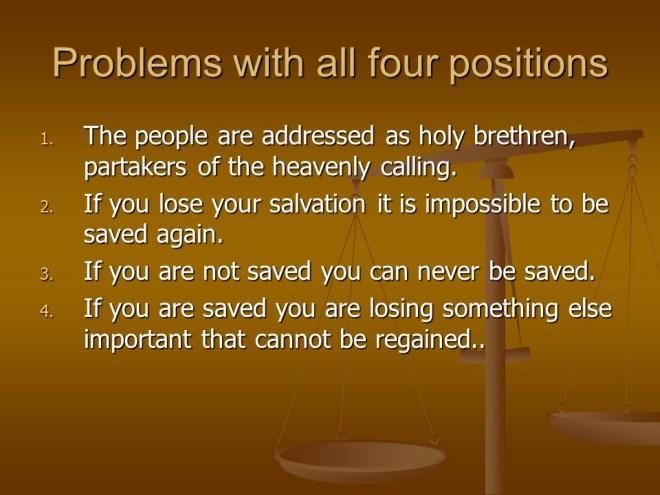 Hebrews 6:1-6 speaks of salvation: Can you lose it, or are you eternally secure? Here I do an exposure explaining the different positions taken by the Roman Catholic Church, the Arminian position, the Calvin Position and the position of the author of the letter. It is quite interesting and enlightening.