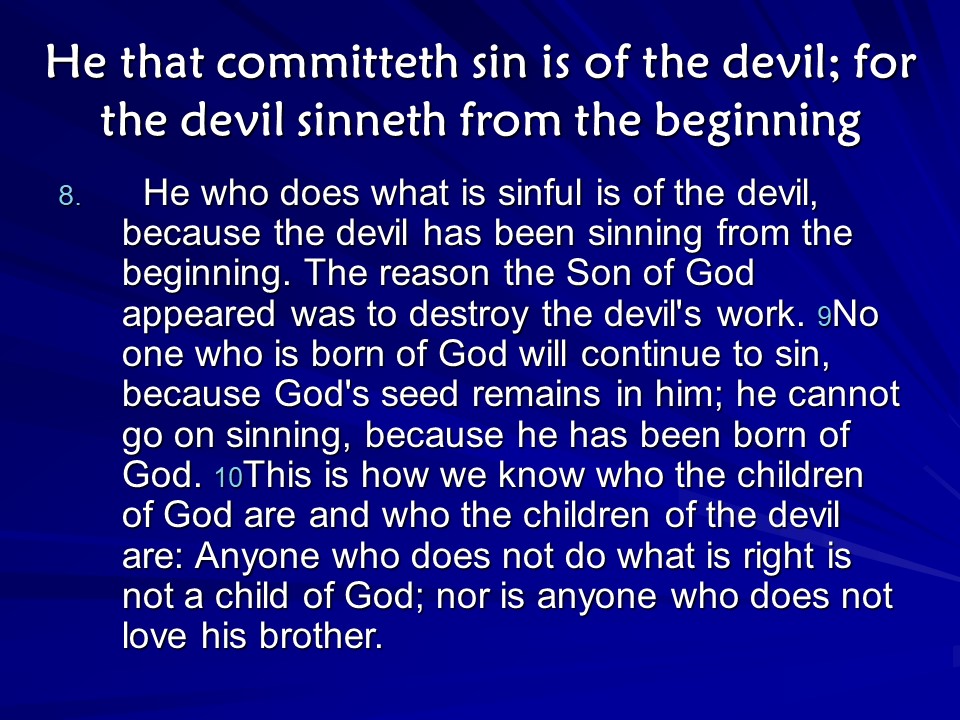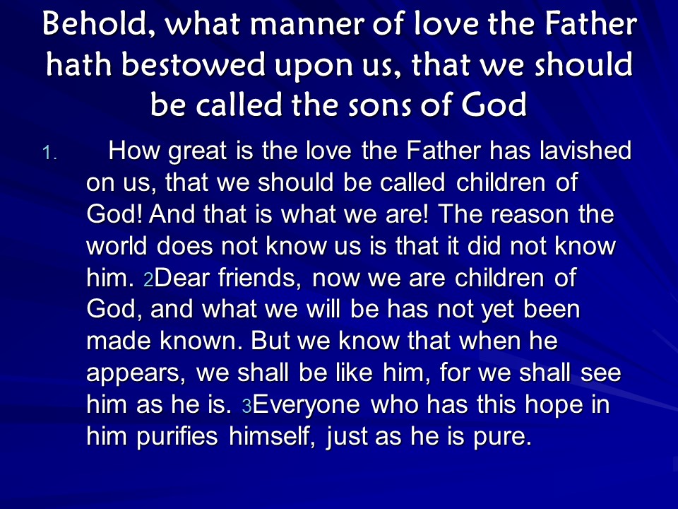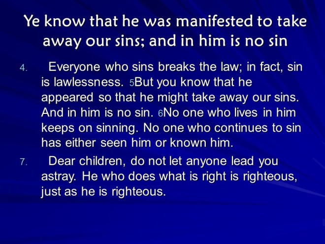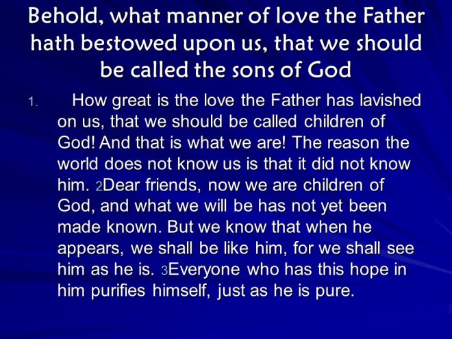 1 John 3:1-10. We are children of God, or as the King James Bible calls it “Behold, what manner of love the Father hath bestowed upon us, that we should be called the sons of God:” As children of God we do not continue to sin, for if we do, we don’t have the spirit of God in us.