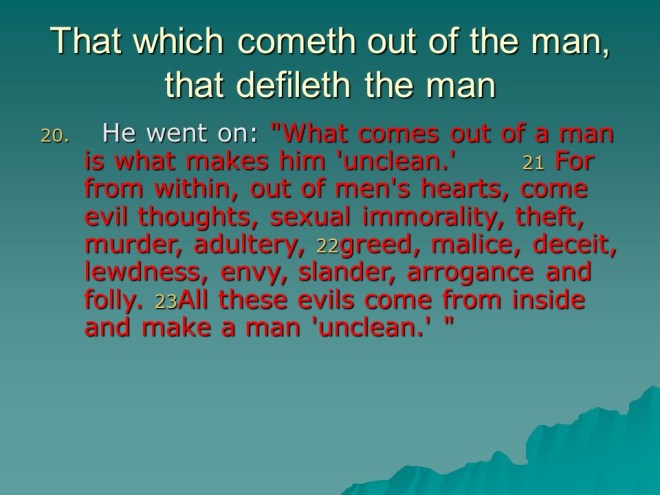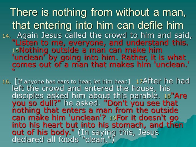 Mark 7:1-23. Jesus explained what is clean and what is unclean.