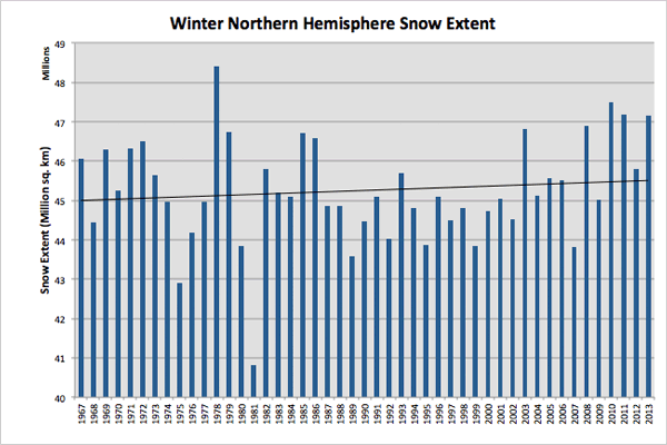 But it will get warmer at the poles. That will cause melting of the ice-caps? Not so fast. When temperature rises the atmosphere can hold more water vapor, so it will snow more at higher latitudes. While winter temperatures will be higher with more snowfall, this will lower the summer temperatures until the extra snow has melted. And that is what is happening in the Arctics