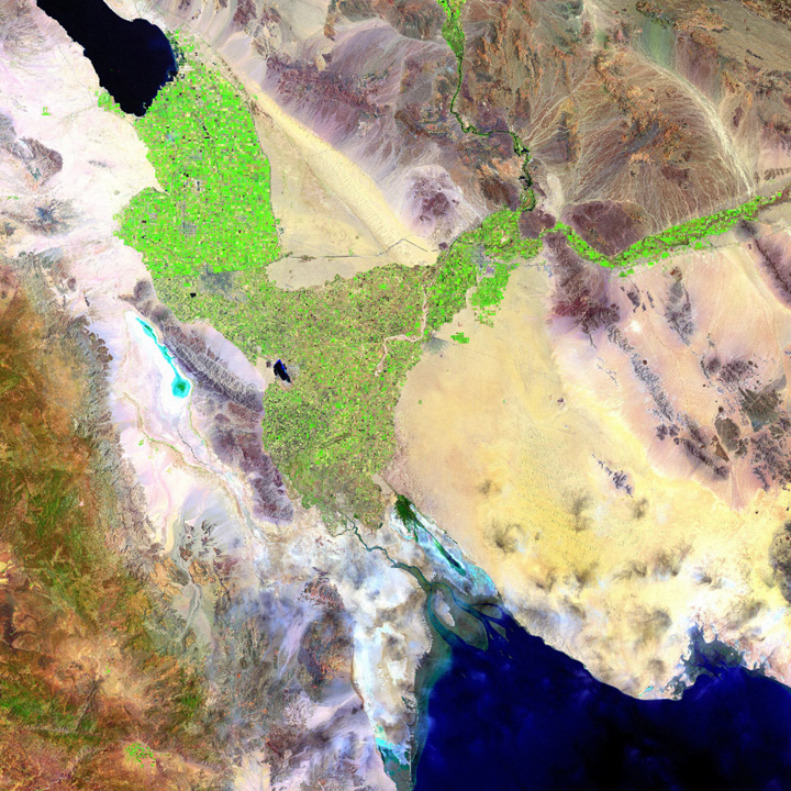 Much of the water from the Colorado River basin is used for agricultural purposes. This is a picture of the irrigation in the lower Imperial valley and Mexico.