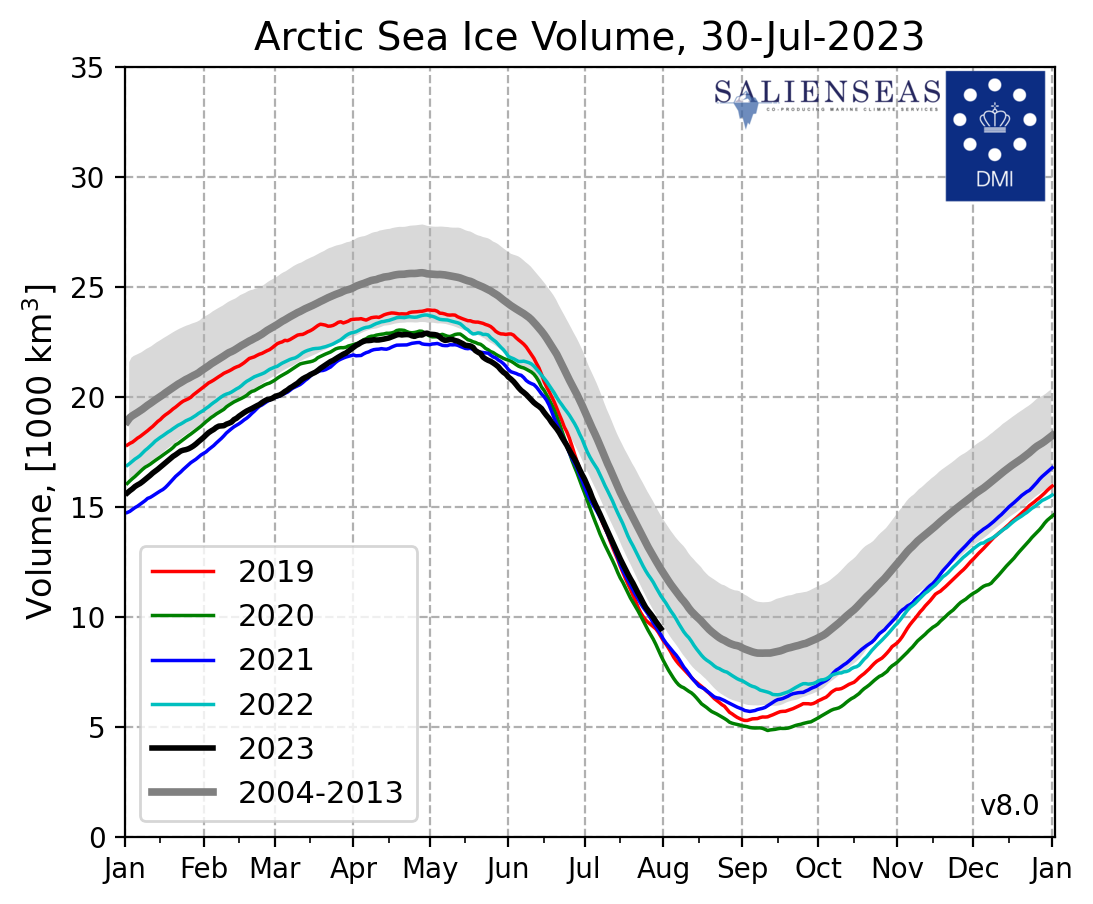 Let us take a look at what is happening to the Arctic ice sheet. Its demise has been predicted to be total well before 2020. How is that going? The Danish Meteorological institute takes daily measurements of the Arctic and Greenland’s ice sheet, volume and temperature.
