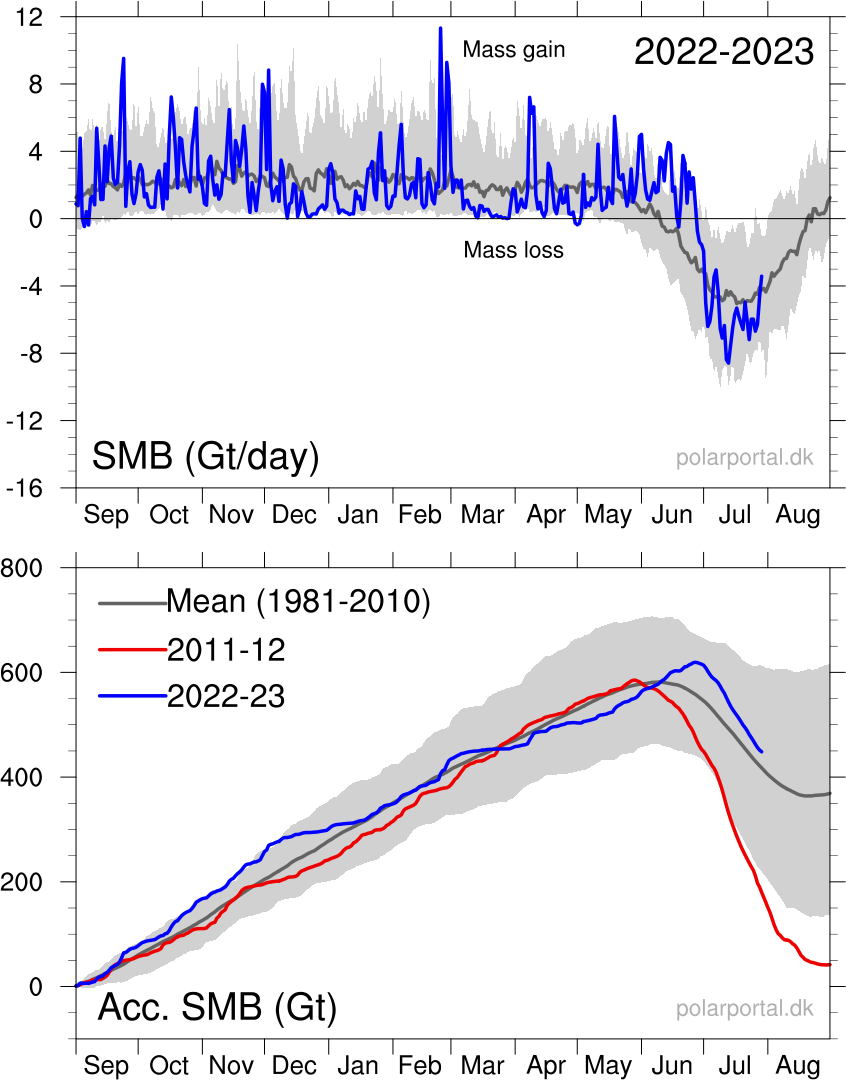 The ice gain, and the summer ice loss over Greenland seem pretty normal to me.Yes the snow melt was delayed by a month,followed bya stronger than normal snow melt. This is all within the boundaries of normal weather.