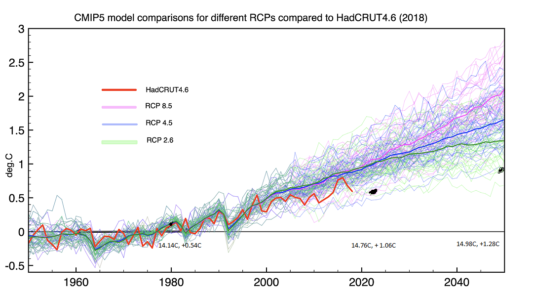 RPC 6 and RPC 4.5 are intermediate stages , while RPC 2.6 achieves net CO2 decline by 2100, but still rising temperature. Here is a figure for the different scenarios.