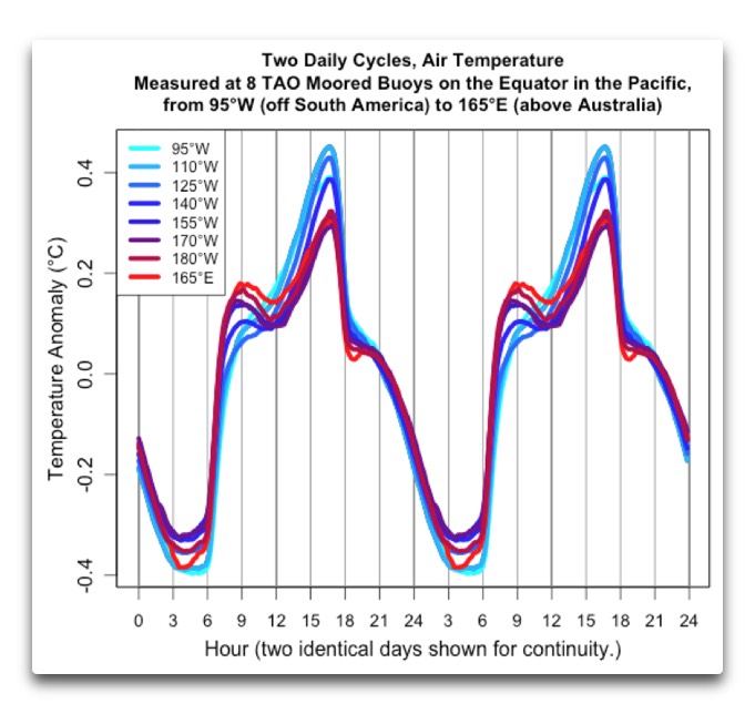 Cumulus clouds are formed in the morning, earlier the warmer it is, and not at all if it is cold, thunderstorms appear when it is warm enough. The figure shows how temperature in the equatorial Pacific rises until about 8:30 a.m, then actually declines between 9 and 12 a.m. even as the sun continues to rise. The feedback, which was positive at low temperatures becomes negative at warmer temperatures, and in the equatorial doldrums, surface temperature has found its equilibrium. No amount of extra CO2 will change that. Equatorial temperatures follow the temperature of the ocean, warmer when there is an el niño, cooler when there is a la niña. Here is a chart of temperature increases since satellite measurements began as a function of latitude.