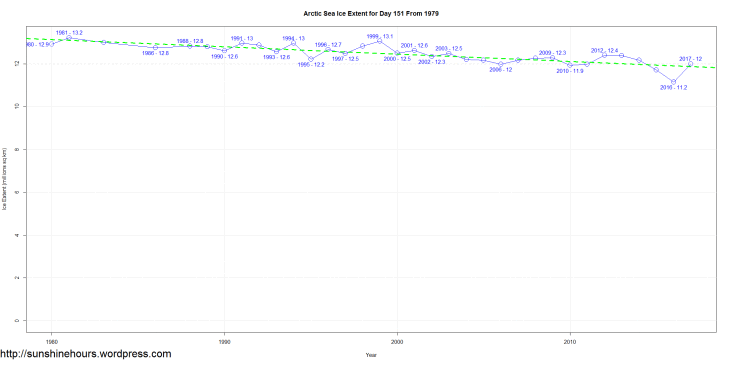 Not so at the poles. the temperature record indicate a noticeable warming with large spikes up and down, up to 3 degree Celsius difference from year to year, especially the Arctic. So, how much has the Arctic melted? Here is a chart of Arctic ice cover for 31 May for the last 39 years.