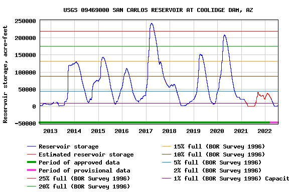 Only once in the last ten years has the lake been filled to even 25% of full capacity, and the last two years the lake has dried out during the most important growing season.All fish has died. The lake is totally useless even for recreational purposes, and nearly worthless for the Phoenix area as water supply. The Central Arizona Project has a capacity of providing 1.4 million Acre-feet a year, but has only been awarded a fraction of its capacity from the Colorado River, and since Lake Mead is drying up, the supply will be reduced to almost nothing.