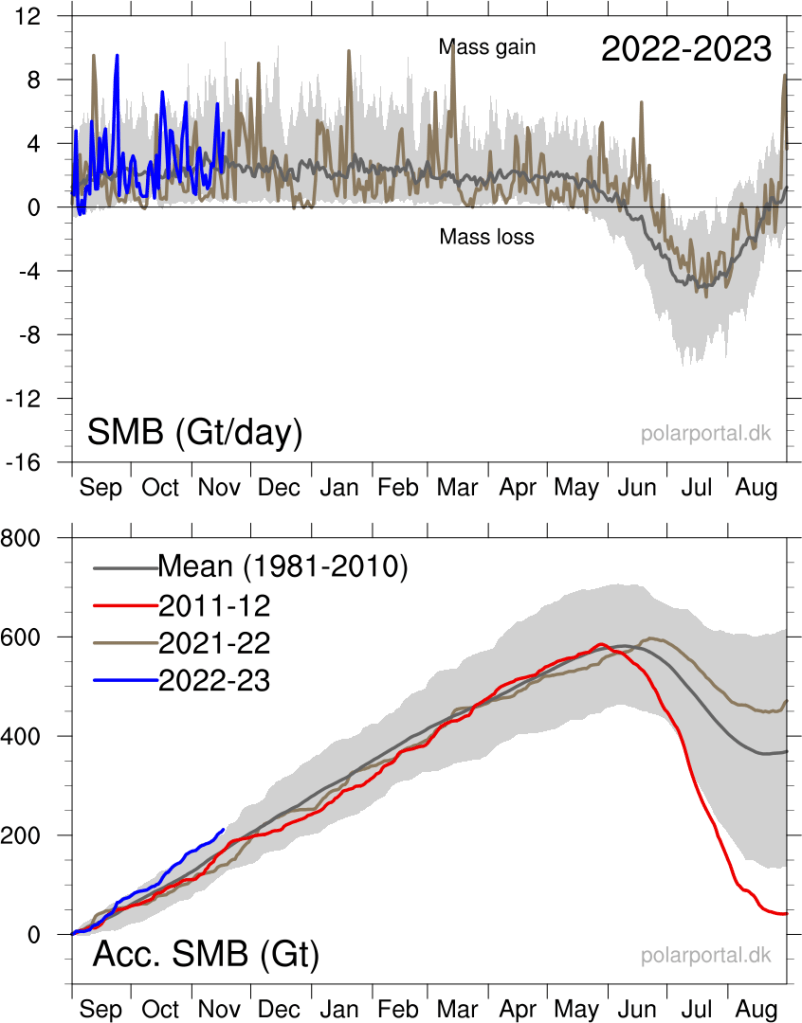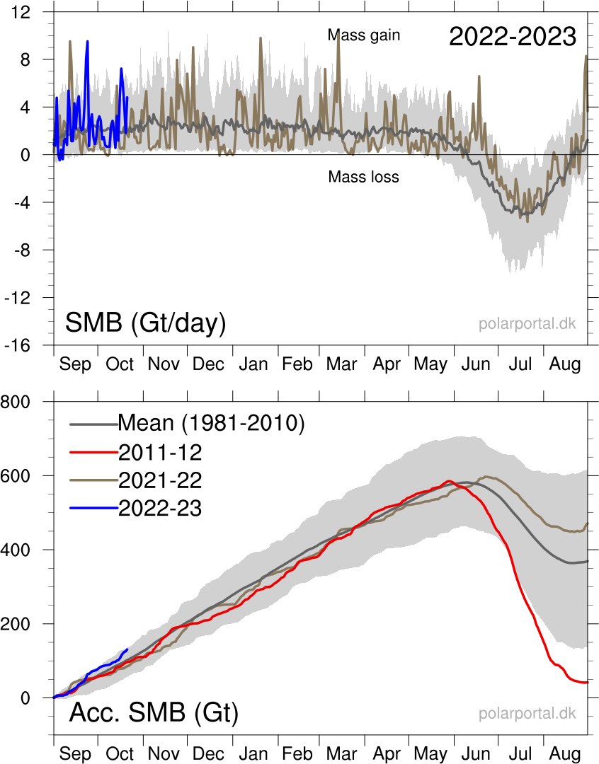 Even more illustrative is the development of ice on Greenland. In 2012 it looked like all of Greenland was going to melt in less than 1000 years, and the polar ice cap would be gone altogether in late summer of 2020. The ice over Greenlnd is now growing ever so slightly again: