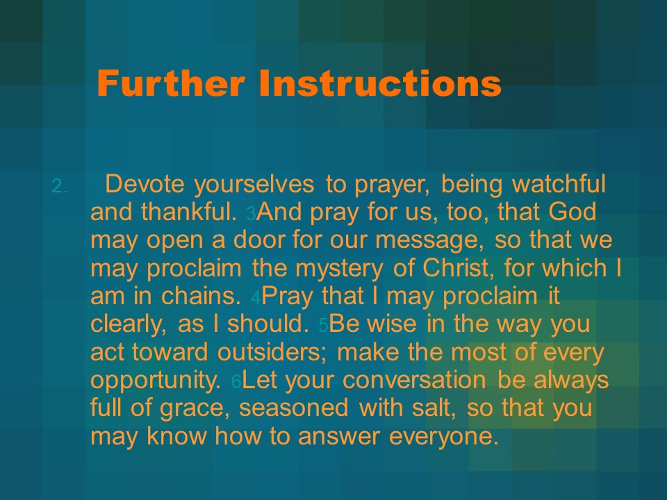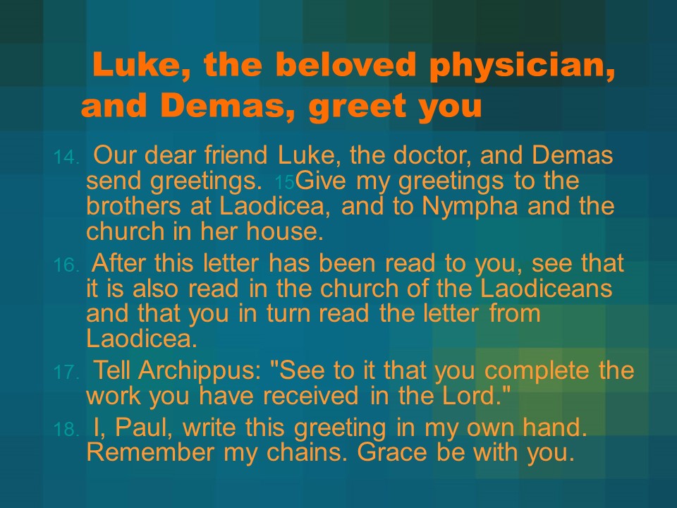 Colossians 4. The Apostle Paul gave final instructions, final greetings and exhortations as he bade the Colossians (and the Laodiceans) God’s grace.