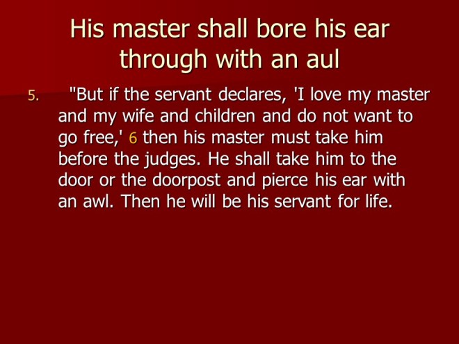 Exodus 21, Mosaic law concerning Hebrew servants, penalty for deaths and injuries. Exodus 21, Mosaic law concerning Hebrew servants, penalty for deaths and injuries. So, a man with a ring in only one ear, is that a sign of slavery? After reading all this, one comes to realize how truly transformative Jesus message is.