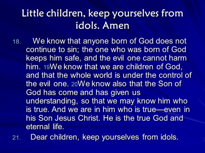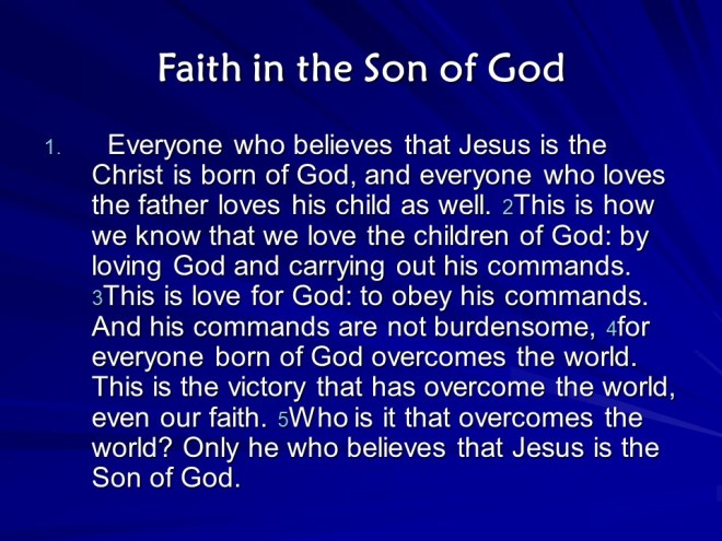 1 John 5. Being born of God and believing in the son of God means exercising obedience by Faith. The certainty of God’s witness is : “These things have I written unto you that believe on the name of the Son of God; that ye may know that ye have eternal life, and that ye may believe on the name of the Son of God.” There is  confidence and compassion in prayer, We must follow the true one and reject the false. And so the letter ends: “Little children, keep yourselves from idols. Amen.”