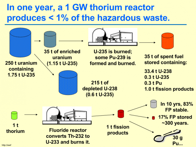There is one minor error in the video. The Thorium-U233 reactors also produce Plutonium, but it only produces Plutonium238, which is needed for space exploration. We are out of Pu238, only Russia has some left.