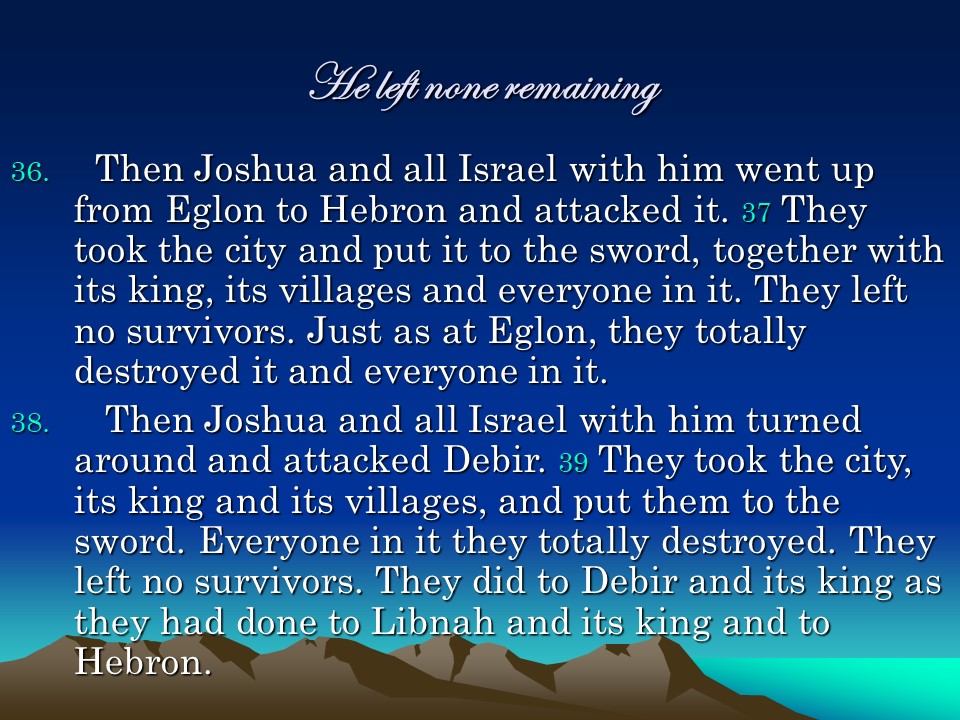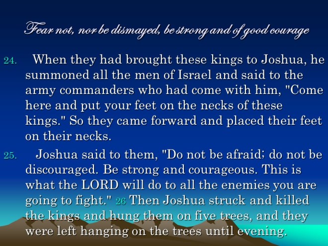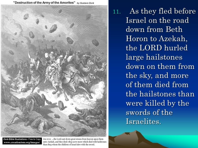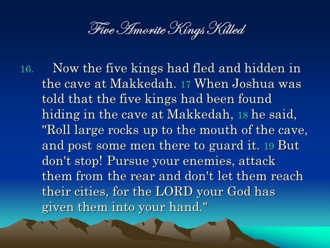 Joshua 10 speaks of further battles, in the battle with the Amorites the sun stood still for a full day. After the LORD gave Israel the victory, the Amorite Kings were executed, followed by the conquest of the Southern cities.