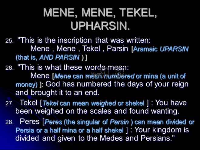Daniel 5. This is the famous chapter with the handwriting on the wall: “Mene, Mene, Tekel, Upharsin“