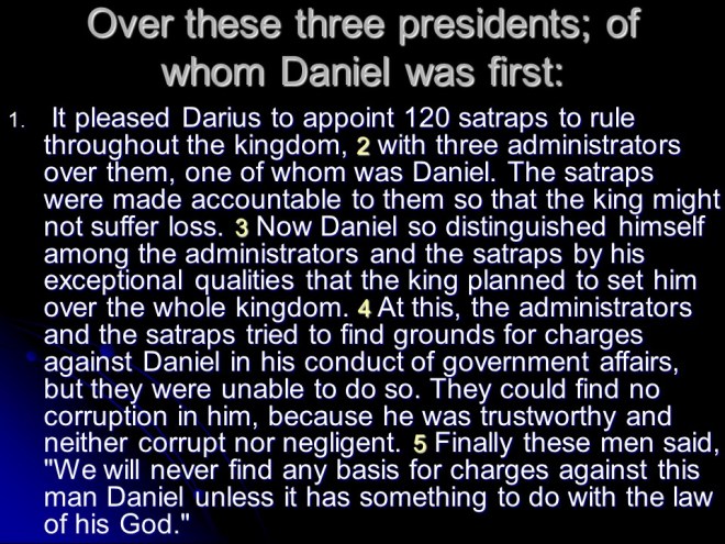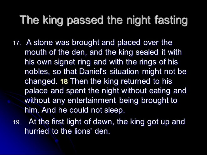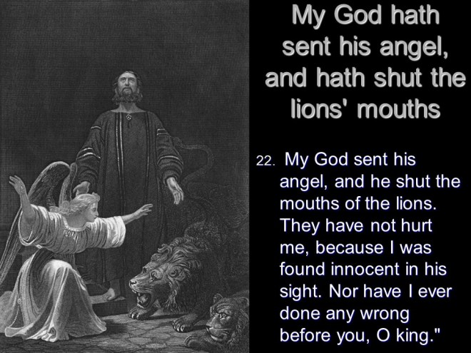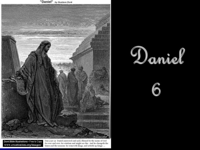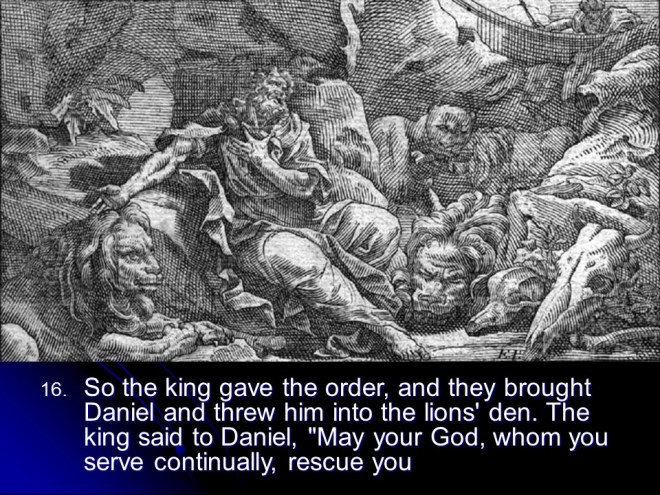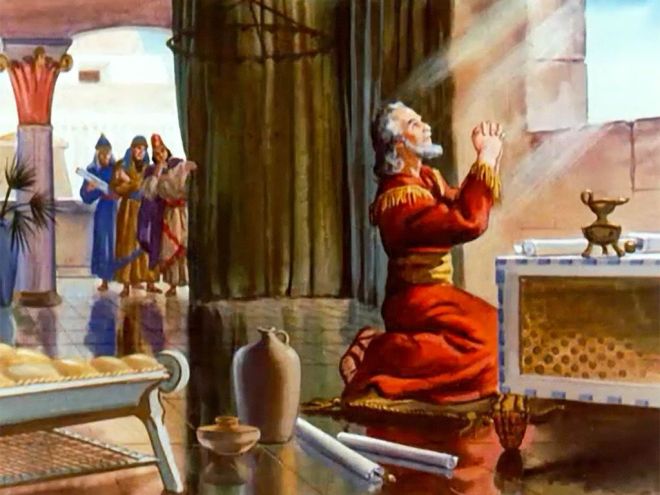 Daniel 6. Time passed. Daniel was by then about 80 years old. He was still praying as he always did, three times a day but not to King Darius, and for that he was thrown into the lions’ den. God sent his angel to protect Daniel, so the next morning he was rescued unharmed, but for his accusers, thrown into the same den after Daniel came out it turned out the lions were really hungry.