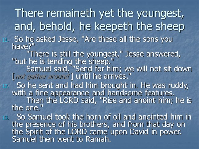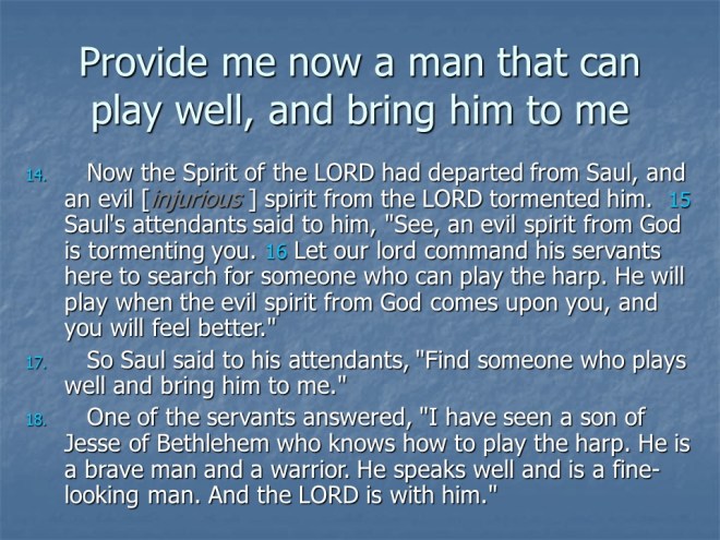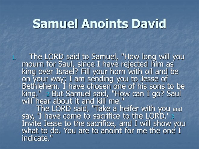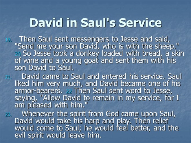 1 Samuel 16. Samuel anointed David as King after rejecting all of David’s older brothers and David entered into Saul’s service while Saul was still the titular King. Whenever Saul’s spirit troubled him David played for him and that soothed Saul.